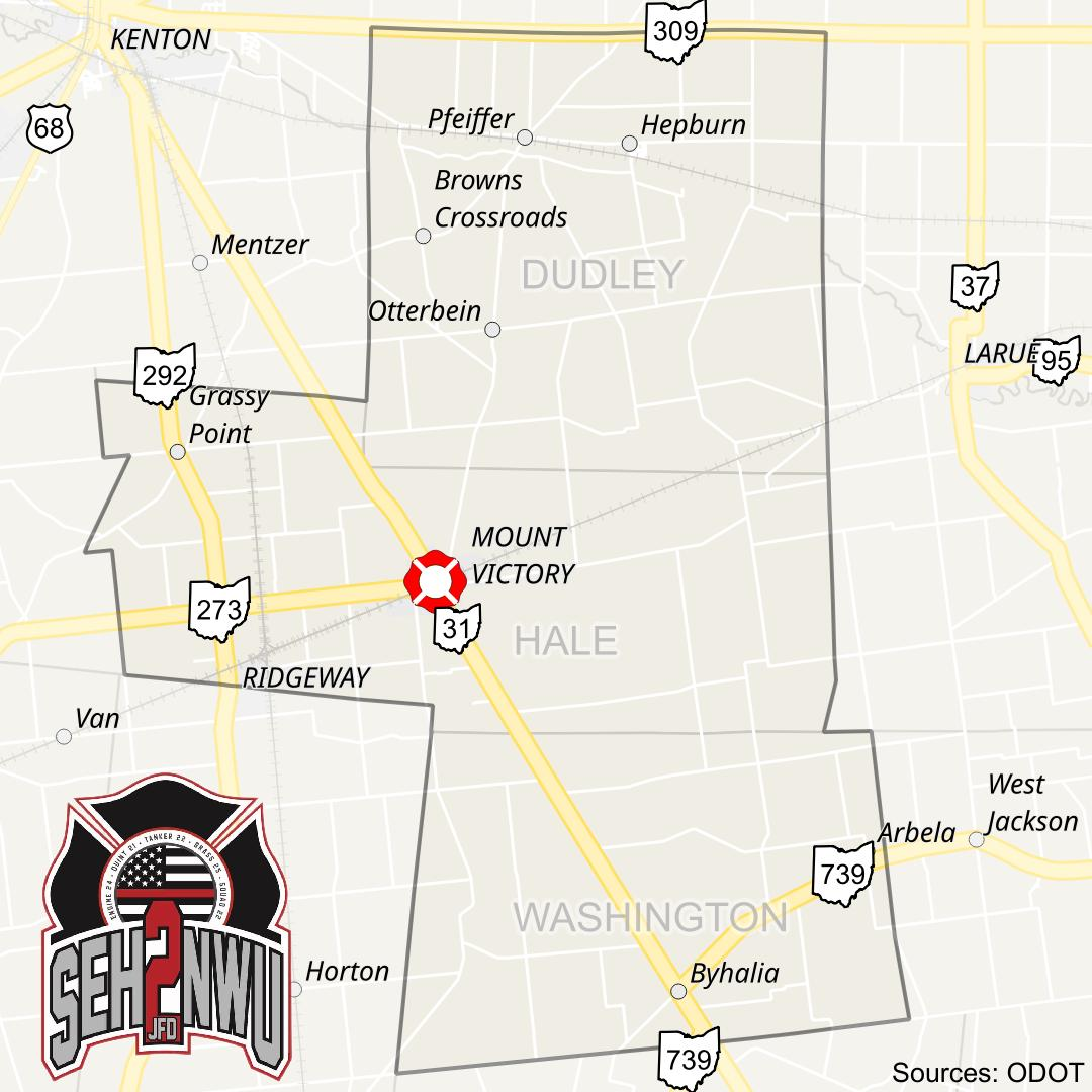 The Southeast Hardin Northwest Union Joint Fire District currently covers 102 square miles and serves Dudley (Hardin), Hale (Hardin), and Washington (Union) Townships as well as the Village of Mount Victory. The SEHNWUJFD was formed in 1999 when the previous Fire Association was dissolved. There are currently 25 fire and EMS personnel on our roster.